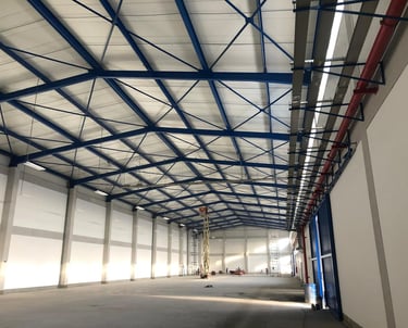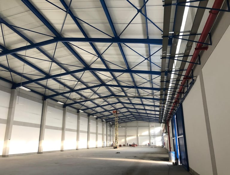 Construcción de complejos industriales y logísticos llave en mano, naves industriales con puentes grúa, techos, almacenes, edificios, losas, muros y estructuras y obras civiles generales.